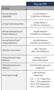 - Buy Up PPO Plan has a $1,300 Individual Network Deductible and a $23,600 Family Network Deductible. And a member coinsurance of 10% until the annual maximum out of pocket is reached.