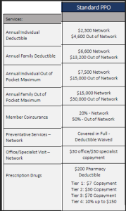 - Standard PPO Plan has a $2,300 Individual Network Deductible and a $6,600 Family Network Deductible. And a member coinsurance of 20% until the annual maximum out of pocket is reached.